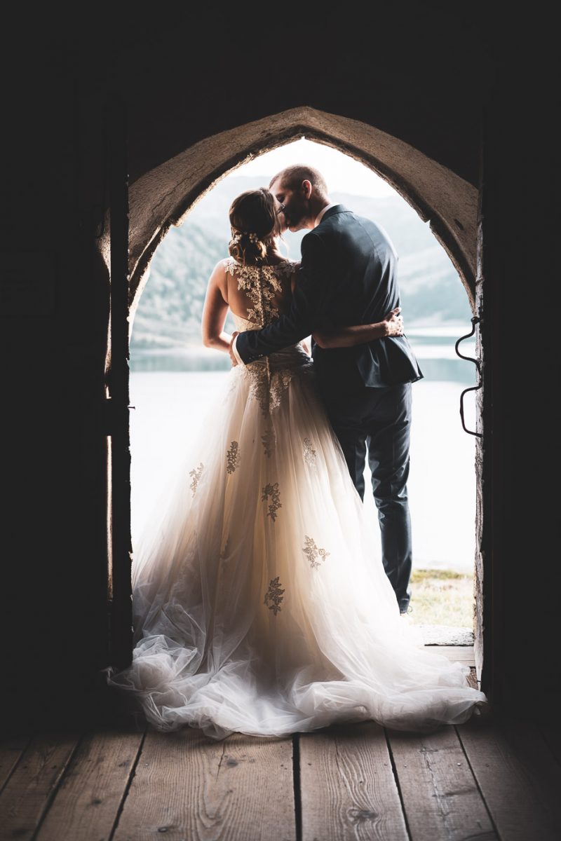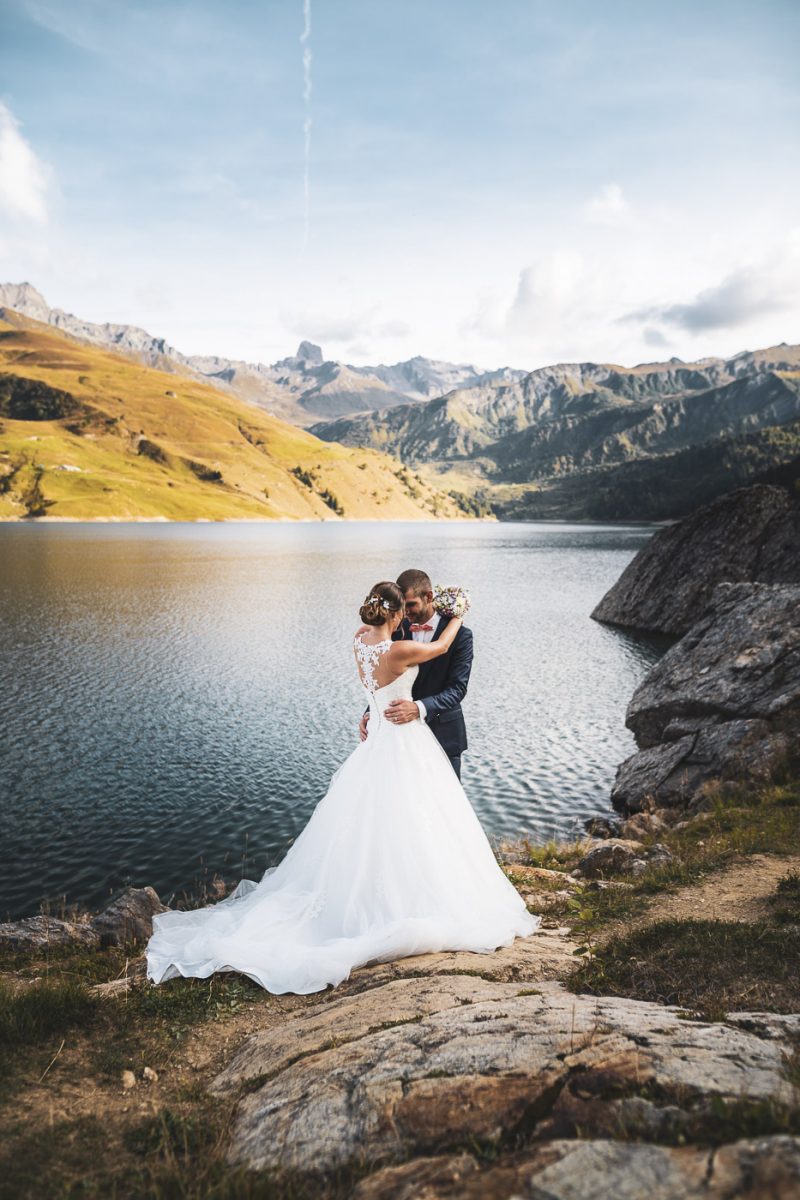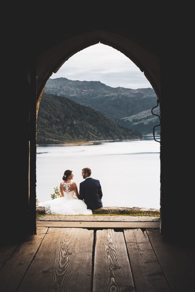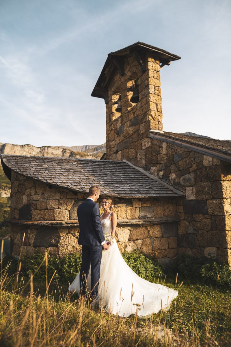 Il fait beau en cette fin d’après-midi dans le Beaufortain. Les rayons du soleil jouent avec les roches escarpées des montagnes et ondulent subtilement dans ce lac d’altitude. Une petite chapelle se dresse, baignée de lumière, proposant un cadre idéal pour nos deux amoureux, Aurélia et Benjamin.