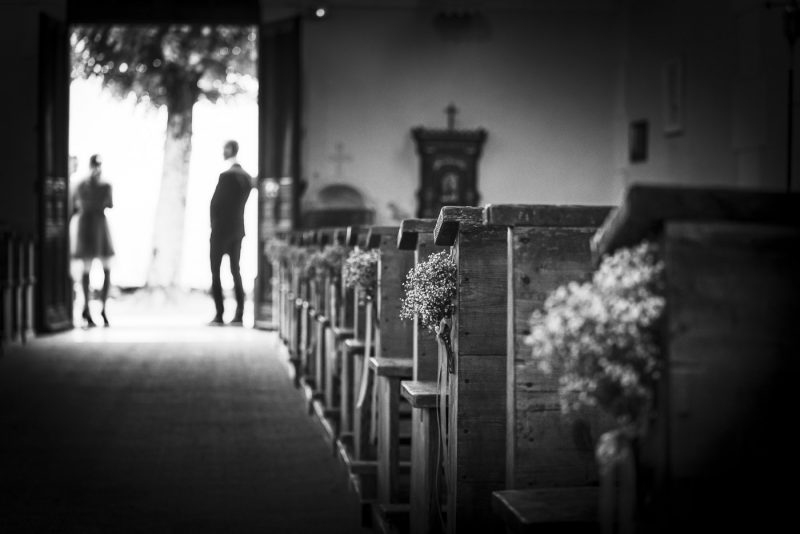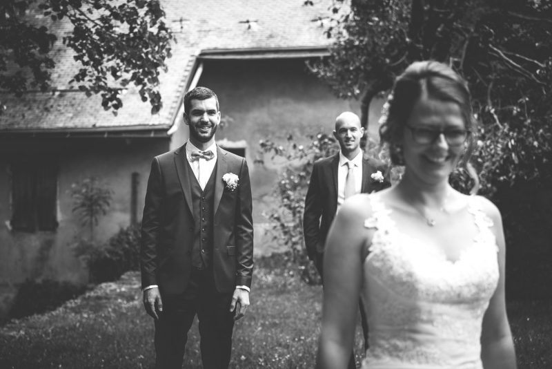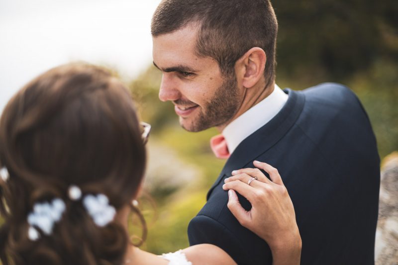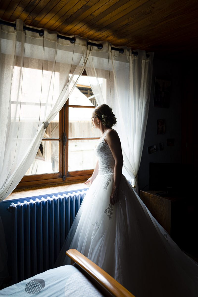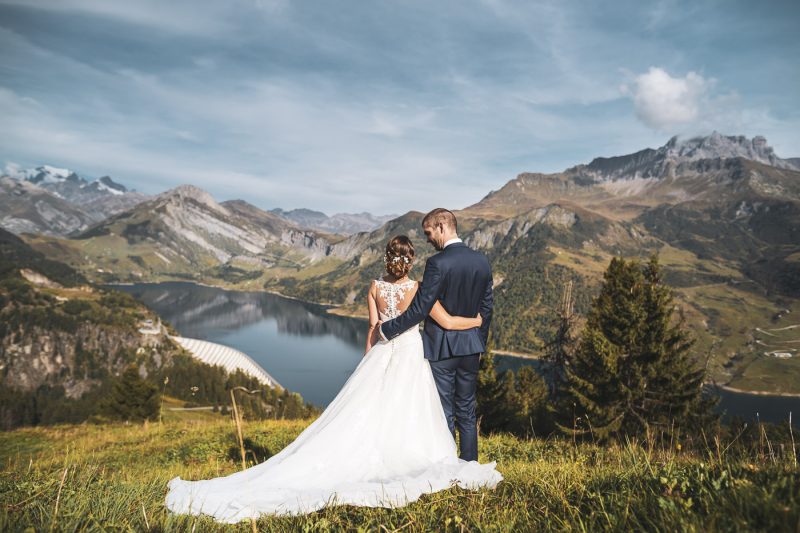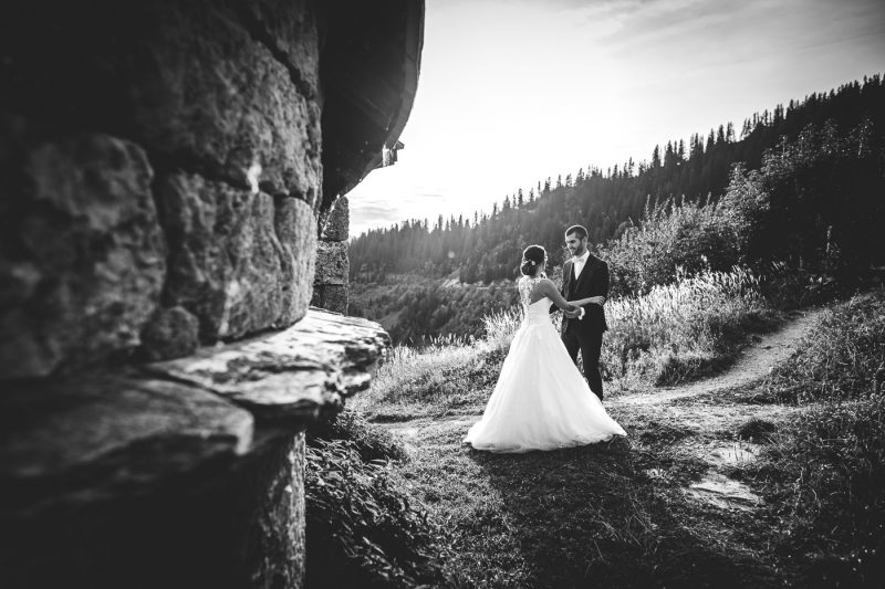 Il fait beau en cette fin d’après-midi dans le Beaufortain. Les rayons du soleil jouent avec les roches escarpées des montagnes et ondulent subtilement dans ce lac d’altitude. Une petite chapelle se dresse, baignée de lumière, proposant un cadre idéal pour nos deux amoureux, Aurélia et Benjamin.